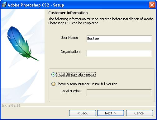 • Da müsste es kurz vor dem Schritt mit der Seriennummer die Möglichkeit geben "30Tage Testversion" installieren. (da ist automatisch die volle Installation angekreuzt, das musst du ändern) :wink: