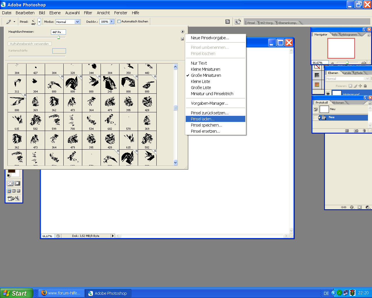 Zu deiner Frage wie man in PS Brushes öffnet,du klickst auf den Pinsel.Dann klickst du oben auf den kleinen Pfeil wo man Brushes auswählen kann dann in den Pfeil der nach