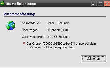 Wenn ich dann auf "Veröffentlichen" klicke, zeigt mir die Meldung an, das der Order "X" auf dem FTP-Server nicht erstellt werden kann: siehe Anlage 2.