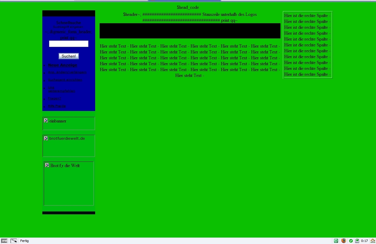 Hallo, bin wie viele andere kein Programmierer und schiebe eigentlich nur bereits vorhandene Code-Schnipsel zusammen. Ich habe ein kostenloses Anzeigenportal im Netz und möchte auf dieser Seite eine weitere Spalte an der rechten Seite installieren. Der Code der Seite ist unten angefügt. Die rechte Spalte existiert bereits.