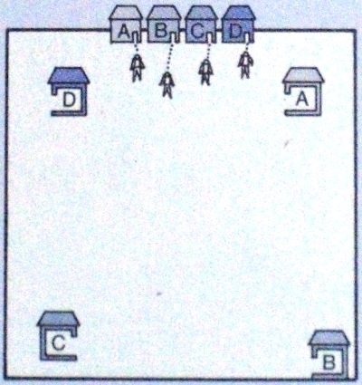 sie legt alle Zehn Ringe auf die Wage. Merkt sich aber welcher wem gehört. Sie rechnet aus, dass das gesammtgewicht 99g beträgt, wenn sie dann weitere Ringe herunternimmt und die Zahl 9 am Ende bleibt, sind sie echt. Wenn plötzlich eine 0 am Ende ist, dann ist er unecht.Vier Schüler wohnen in A, B, C und D und besuchen jeweils die Schule ihres Ortes. Ihre Fußspuren aber zeigen, dass keine die anderekreuzt oder außerhalb des Quadrats liegt. Wie sind die Jungen gegangen?