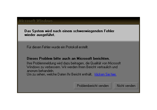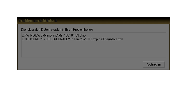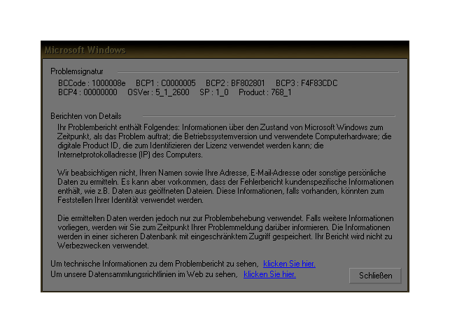 • Hallo leute kann mir jemand helfen hab ein Problem mit meinem Pc!Der hängt sich oft auf,und dann kommt diese Fehlermeldung:Bild1 Wenn man dann auf um zu sehen welche daten ihr Bericht enthält klickt,kommt dieses Fenster:Bild2 Und dann klickt man auf,um Technische Informationen zu ihrem Problembericht zu sehen,kommt dieses Fenster:Bild3!!!kommt in letzter zeit wirklich oft vor.bitte um hilfe