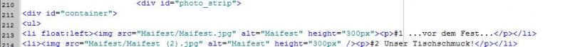http://validator.w3.org/check?verbose=…rsammlung09.htmDann nimm mal bei #container das overflow raus und setz es bei #photo_strip ein. Dir geht es ja um einen Scrollbalken in der X-Achse, also ist hier die Breitenangabe wichtig die Du in #photo_strip setzt und nicht bei #container.