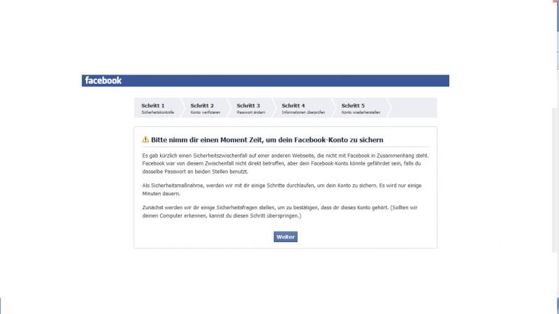 ich hoffe das ich hier richtig bin... und zwar ich habe folgendes Problem wenn ich mich bei facebook anmelden möchte kommt die nachricht bitte nimm dir einen Moment Zeit, um deinen facebook Account zu sichern... das ganze soll in 5 schritten passieren lauter sicherheitsabfragen.... schritt 1:Sicherheitskontrolle Schritt2:Konto verifizierung Schritt3:Passwort ändern Schritt4:informationen überprüfen und schritt 5 wäre konto wiederherstellen nur sobald ich bei schritt 4 angelangt bin und ich auf weiter klicke... komme ich immer wieder auf die startseite von facebook um mich neu anzumelden sprich ich erreiche den 5 schritt nicht. Habe das ganze jetzt schon 100x probiert... und habe auch "facebook" schon mehrere emails geschrieben. Weiß jmd von euch an was das liegen könnte? bzw was ich dagegen tun könnte?
