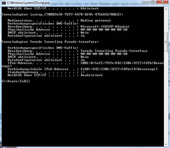 • Mach' mal ein Eingabe-Fenster auf (cmd) und gebe ein: ipconfig /all und poste den Bereich von "Drahtlos-LAN-Adapter Drahtlosnetzwerkverbindung"