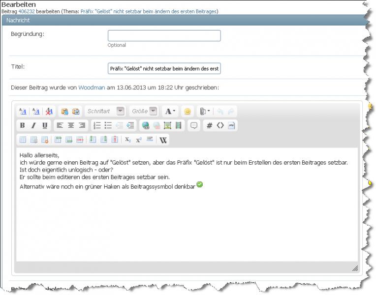 ich würde gerne einen Beitrag auf "Gelöst" setzen, aber das Präfix "Gelöst" ist nur beim Erstellen des ersten Beitrages setzbar. Ist doch eigentlich unlogisch - oder?