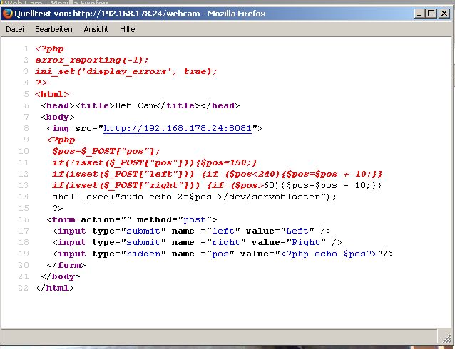 Ziel ist eine Raumüberwachung via Internet! Das Projekt besteht aus einem PI, einer Web Cam und einem Servomotor. Diese Komponenten sollen über das folgende Skript gesteuert werden.