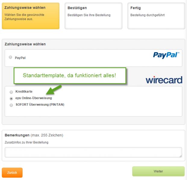 Bei PayPal kein Problem, da nur ein Button vorhanden. Jedoch bei WIrecard wird automatisch immer Sofortüberweisung aktiviert. Kreditkarte und EPS lassen sich nicht anklicken.