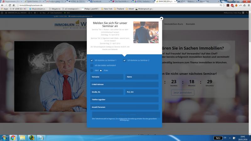 <form name="seminaranmeldung" method="POST" id="seminaranmeldung" enctype="multipart/form-data"> <div class="full"> <div class="one_half"><input type="checkbox" name="teilnahme" id="sesem1" value="Seminareins" checked> Ich komme zu Seminar 1</div> <div class="one_half et_column_last"><input type="checkbox" name="teilnahme2" id="sesem2" value="Seminarzwei" checked> Ich komme zu Seminar 2</div> </div> <div class="full"><input type="checkbox" name="teilnahme3" id="severh" value="verhindert"> Ich bin leider verhindert</div> <div class="full"> <input type="radio" name="sex" id="sesex" value="Herr" checked> Herr <input type="radio" name="sex" value="Frau" checked> Frau </div> <div class="clear"></div> <div class="full"> <p class="left-one"><input placeholder="Vorname" type="text" id="sevorname" name="vorname" value=""></p> <p class="left-one-last"><input placeholder="Name" type="text" id="sename" name="name" value=""></p></div> <div class="clear"></div> <div class="full"><input placeholder="E-Mail Adresse" type="text" id="semail" name="email" value=""></div> <div class="clear"></div> <div class="full"><p class="left-one"><input placeholder="Straße, Nr." type="text" id="sestrasse" name="strasse" value=""></p> <p class="left-one-last"><input placeholder="PLZ, Ort" type="text" id="seort" name="ort" value=""></p></div> <div class="clear"></div> <div class="full"> <input placeholder="Telefon tagsüber" class="custom-contact-form-field-full" type="text" id="setelefon" name="telefon" value=""></div>