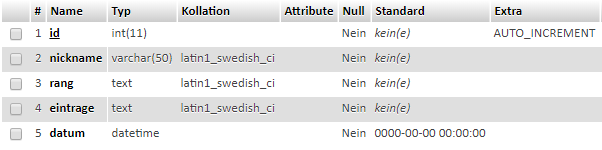 In der Tabelle gibt es Name, Rang, Infos, Funktionen und ID