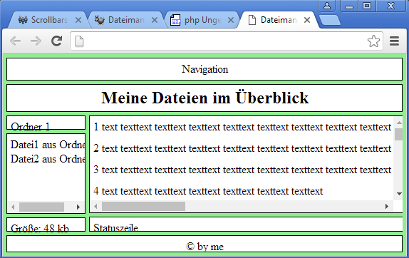 • djheke: Ich bin immer daran interessiert...leider arbeitest du mit relativen Breiten, was zu horizontalen Scrollbars im Feld der Dateiauflistung führt (siehe Screenshot) ...ich würde es gerne so habe, dass das Feld immer so breit ist wie der längste Dateiname bzw. der längste Ordnername! Den Rest soll das Feld mit dem Dateiinhalt bekommen.