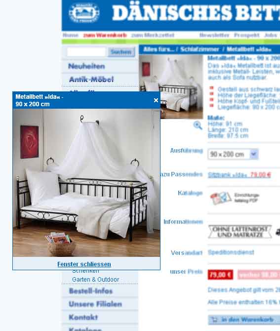 Hallo Leute, wenn man auf der Internet Seite vom Dänischen Bettenlager (http://www.daenischesbettenlager.de) im Shop auf die Artikelbild Vergrößerung klickt, erscheint ein neues, übergeordnetes Fenster, in dem nur der Artikel zu sehen ist. Das sieht richtig gut aus wie ich finde. Wer kann mir sagen wie das geht?