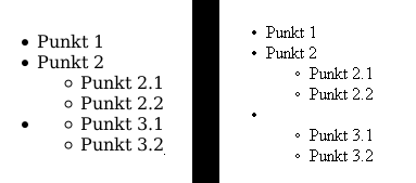 Alles anzeigen<!DOCTYPE HTML> <html> <head> <title></title> </head> <body> <ul> <li>Punkt 1</li> <li>Punkt 2 <ul> <li>Punkt 2.1</li> <li>Punkt 2.2</li> </ul> </li><li> <ul> <li>Punkt 3.1</li> <li>Punkt 3.2</li> </ul> </li> </ul> </body> <html>erzeugt folgende Darstellungen: Links die Darstellung in Firefox, Opera, Chromium, WebKit usw., rechts die Darstellung in IE8. Kann mir jemand sagen, wie sich Edge und die anderen IE-Versionen ab Version 7 verhalten?