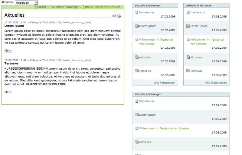 Links ist der Content-Bereich / Auflistung der News mit Anzeige der Kurzbeschreibung und des Titels der News.