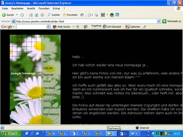 auf seite 2 gibt es einträge vom "durchblick team" "bla" & "trinity" ... sind irgendwelche jungs aus der parallelklasse, klasse oder so, die sich mal wieder ganz toll fühlen. das ist im moment echt schrecklich, weil diese 15-jährigen jungs nicht mit ihrer pupertät umgehen können. nein die sind wirklich fies zu allen, die einfach nicht mitziehen wollen. und jetzt spammen diese mein gästebuch, machen mich nicht fertig, aber sie spammen auch woanders, aber wie soll ich die auch ausfinding machen.