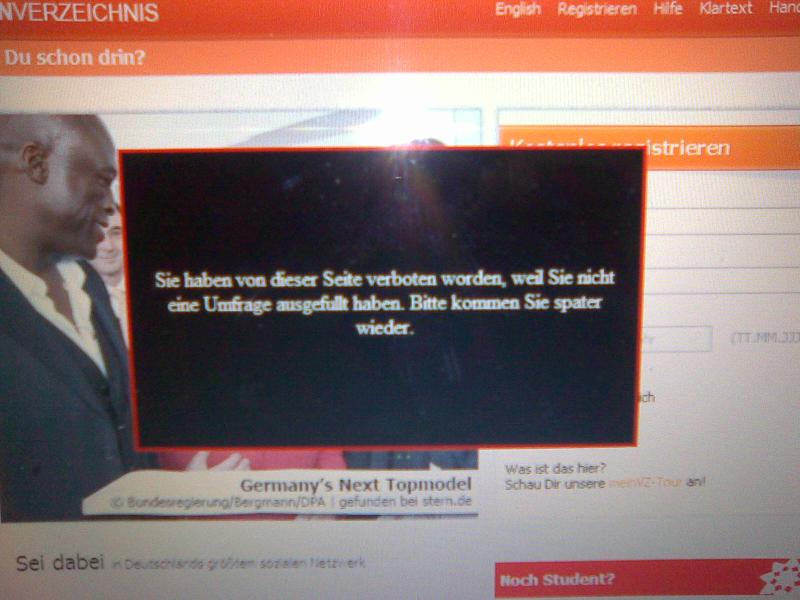 ich wollte heute mit dem explorer bisschen surfen dann öffnete sich ein fenster wo ich einen IQ-test machen sollte, hab ich natürlich weggeklickt, doch dann kam die anzeige, ich zitiere: Sie haben von dieser Seite verboten worden, weil sie nicht eine umfrage ausgefullt haben. Bitte kommen Sie spater wieder.