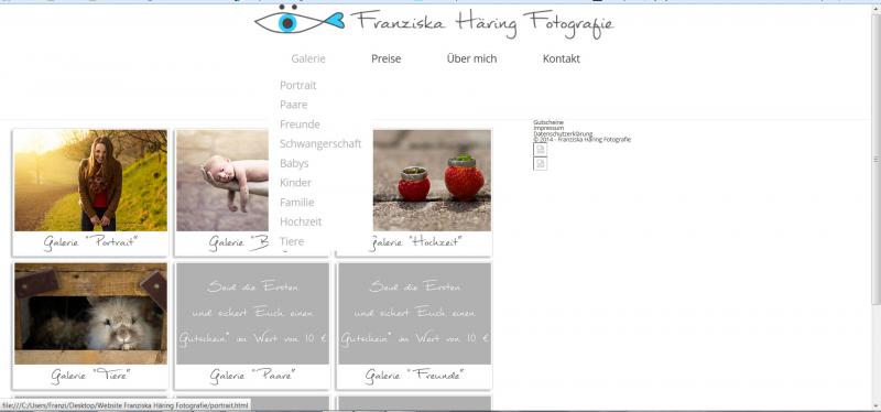 - wenn man von Galerie nach Kontakt fährt sind zwischen Galerie, Preise, Über mich und Kontakt immer Verlinkungen (Hand-Symbol). Bei meiner weebly Adresse sind immer Leerräume dazwischen (Pfeil-Symobl), in denen man nichts anklicken kann.