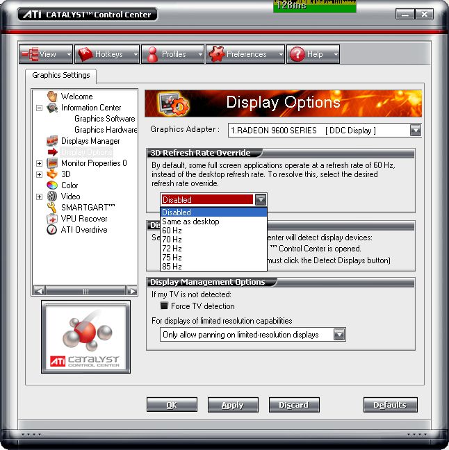 Du kannst im ATI treiber irgendwo einstellen dass er bei open GL bzw. Direct 3D bei einer bestimmten auflösung gezwungen eine bestimmte Bildwiederholfrequenz nutzen soll...