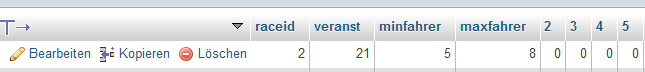 ich habe vor kurzem begonnen mich mit HTML, PHP, mysql auseinanderzusetzten. Nach einiger Zeit geht es jetzt so langsam gut vorran und ich bekomm auch dass meiste hin wo ich möchte. Nun bin ich an ein Problem gestoßen wo ich nicht weiter komme. Ich habe eine Tabelle Namens race_nominieren und darin gibt es mehrere Spalten. Darunter sind einige mit mehreren Nummern als Spaltenname.