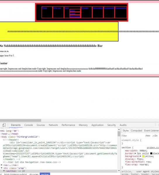 Alles anzeigenhtml { box-sizing: border-box; border:3px solid black; } body { min-height: 100%; max-width: 1280px; margin: 0 auto; border:20px solid pink; display: flex; flex-wrap: wrap; } nav { margin:0 auto; max-width: 900px; background: black; border: 9px solid red; flex-wrap: wrap; display: flex; } nav ul { display: flex; max-width: 900px; flex-wrap: wrap; } nav ul li { list-style-type: none; max-width: 900px; background: black; border: 3px solid red; flex:1; } section { max-width: 900px; border: 3px solid black; background: yellow; display: flex; flex-direction: row; flex-wrap: nowrap; } section > article { padding: 2em; border-radius: 1em; margin: 2em; }HTML