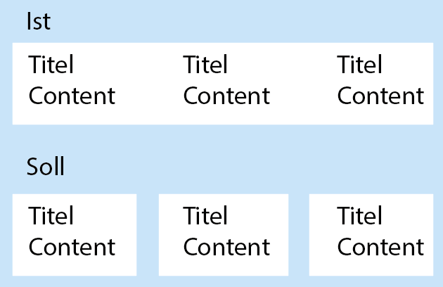 Alles anzeigen<div class="row"> <div class="thumbnails col col-xs-12 col-sm-6 col-md-3 col-lg-3 col-1"> <div>Titel</div> <div>Content</div> </div> <div class="thumbnails col col-xs-12 col-sm-6 col-md-3 col-lg-3 col-1"> <div>Titel</div> <div>Content</div> </div> <div class="thumbnails col col-xs-12 col-sm-6 col-md-3 col-lg-3 col-1"> <div>Titel</div> <div>Content</div> </div> </div> .thumbnails { background-color: #fff; padding: 0.9em; } -