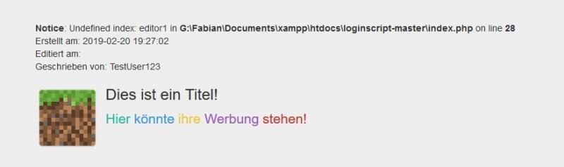 Code[B]Notice[/B]: Undefined index: editor1 in [B]G:\Benutzer\Documents\xampp\htdocs\loginscript-master\index.php[/B] on line [B]26[/B]