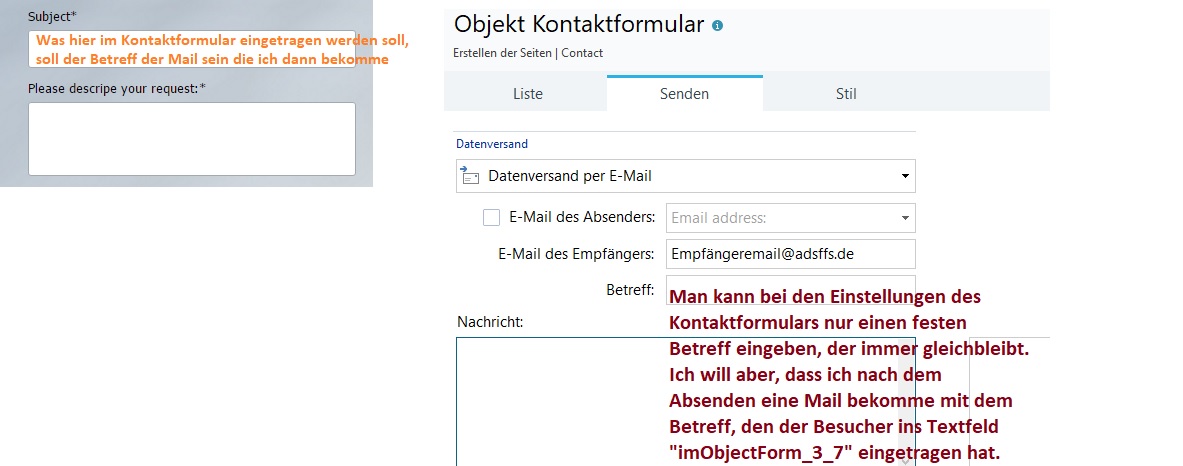 'Dieser Betreff soll ersetzt werden' ist dieser Betreff den man in den allgemeinen Einstellungen des Formulars eingibt und der dann für immer gleich bleibt. Mein Plan war jetzt einfach stattdessen imObjectForm_3_7 einzugeben aber selbst wenn ich an dieser Datei (imEmailForm.php)scheinbar gar nichts ändere und sie nochmal extra hochlade kommt nach dem Absenden des Formulars immer der folgende Fehler und auch keine Mail an: