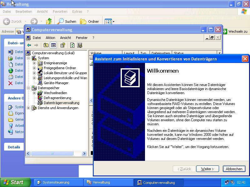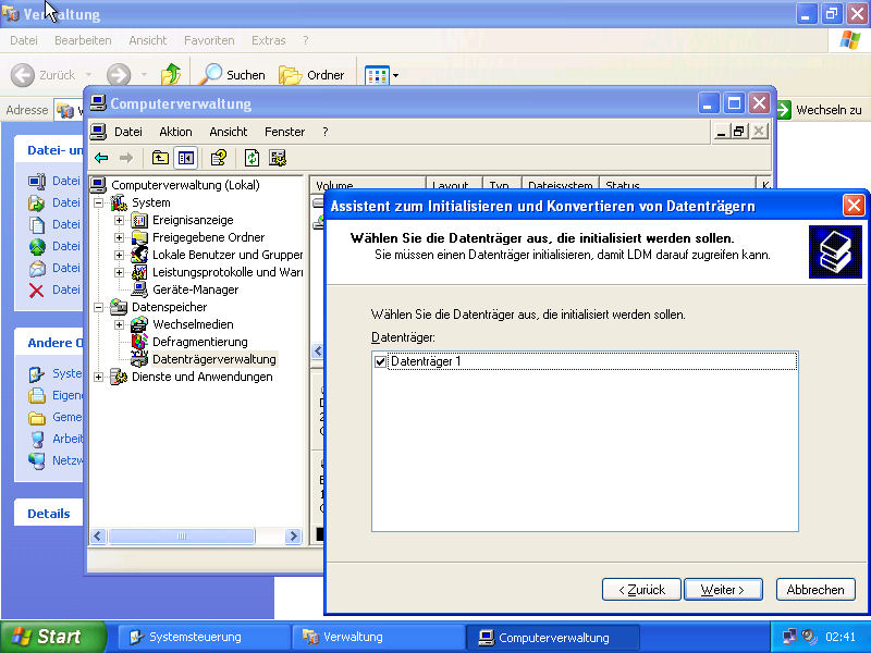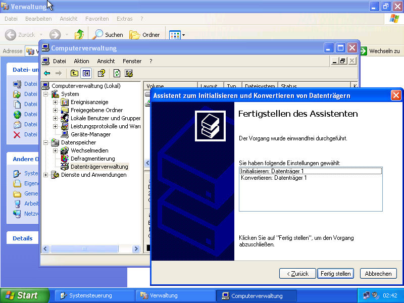 Dann die platte auswählen und ein Dateisystem drauf packen. Am besten NTFS. Falls dir Partition Magic zu teuer ist (-;