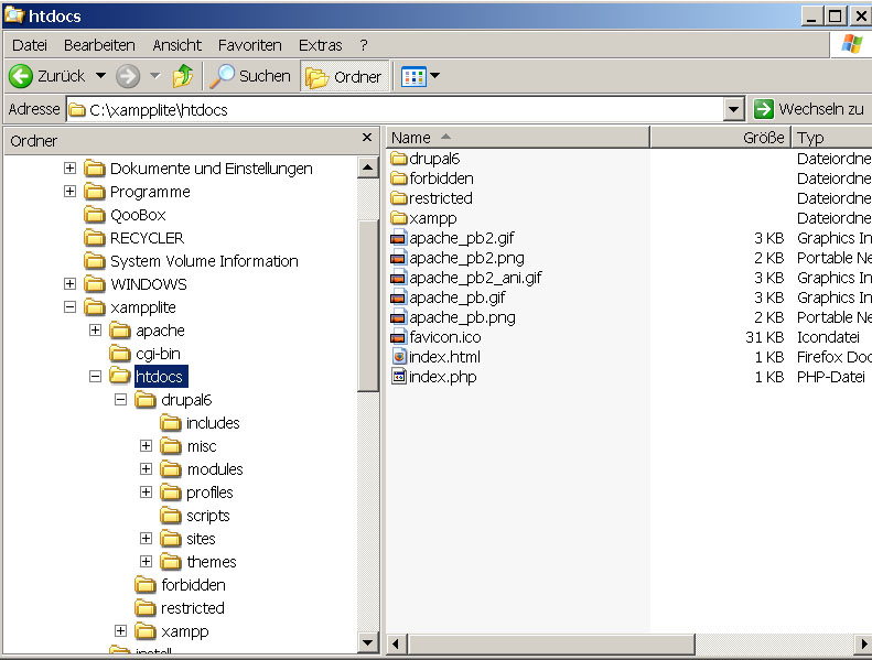 XAMPP läuft, Drupal 6 runtergeladen, Drupal 6 Ordner in den HTTPdocs -Ordner kopiert.